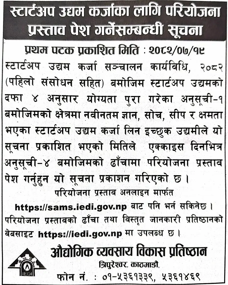 सरकारले स्टार्टअप उद्यम कर्जाका लागि परियोजना प्रस्ताव आह्वान गरेको छ । औद्योगिक व्यवसाय विकास प्रतिष्ठान, काठमाण्डौले एक सूचना निकालेर स्टार्टअप उद्यम कर्जा सञ्चालन कार्यविधि बमोजिम कर्जा लिन इच्छुक योग्य उद्यमीबाट आवेदनको आह्वान गरेको हो ।