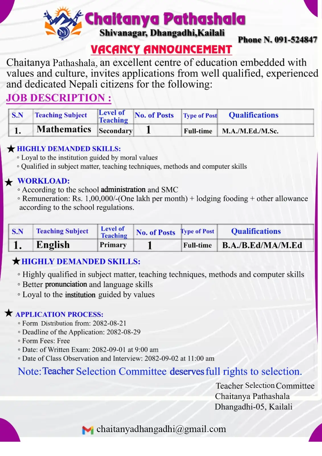 पाठशालाले एक सूचना जारी गर्दै माध्यमिक तह पढाउने दक्ष गणित शिक्षकका लागि दरखास्त माग गरेको सुचनामा उल्लेख छ । पदपूर्ति समितिका अनुसार दक्ष र योग्यता पुगेका नेपाली नागरिकले आवेदन दिन सक्नेछन् । सुदूरपश्चिम प्रदेशमा रहेको उक्त विद्यालयले शिक्षकलाई खाना र बस्नको सुविधा पनि पाठशालाले दिने छ । उक्त दरखास्तमा मंसिर २९ गतेसम्म नि:शुल्क आवेदन दिन सकिनेछ । दरखास्तको शुल्क समेत निशुल्क गरिएको विद्यालयले जनाएको छ ।